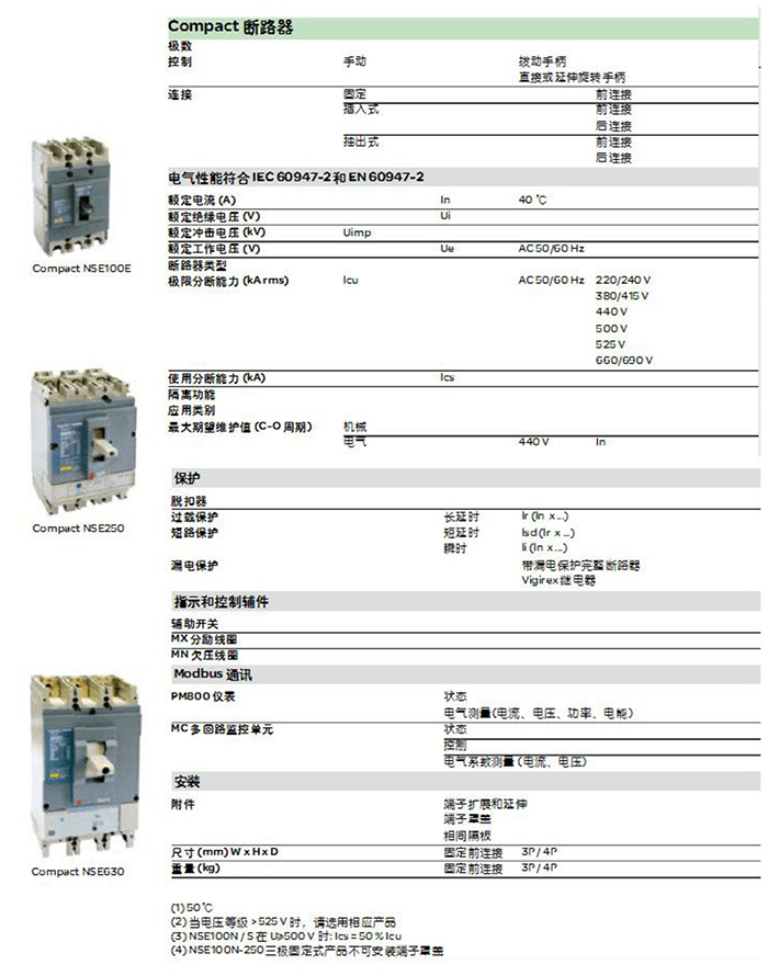Compact NSE 系列塑殼斷路器適用于交流 50/60 Hz,額定工作電壓 690V(1),額定電流 15 至 630 A 的配電網(wǎng)絡(luò)中用于分配電能和保護線路,電源及用電設(shè)備免受過載和短路的危害,提高了供電的可靠性與連續(xù)性。