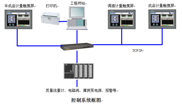 系統(tǒng)概述 隨著工業(yè)化發(fā)展的浪潮,相應(yīng)的提高白酒生產(chǎn)的自動化水平就成為當前亟待解決的問題,據(jù)此本文設(shè)計白 酒勾調(diào)生產(chǎn)自控系統(tǒng),對白酒生產(chǎn)勾兌環(huán)節(jié)進行全面的自動化控制。系統(tǒng)設(shè)計為以西門子S7-300系列PLC為核心的現(xiàn)場總線控制系統(tǒng)。通過人機界面的設(shè)計實現(xiàn)了對現(xiàn)場設(shè)備的實時監(jiān)控。最終實現(xiàn)了計算機通訊、控制、顯示、管理技術(shù)與相關(guān)的生產(chǎn)工藝過程有機結(jié)合,管理系統(tǒng)可記錄酒體相關(guān)信息包括:品種、體積量、質(zhì)量、酒度、液位高度、進罐時間、存罐時間、液位變化曲線等信息;保證了對酒的流量、勾兌純水的流量、罐體之間倒酒量、各罐進酒量的精確計量和精確控制。